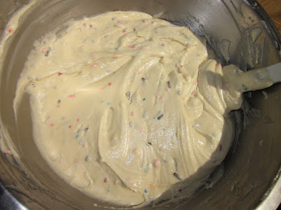 Making funfetti cake is not at all harder than any other cake. I didn't chase down leprechauns or capture rainbows to throw in to the batter, which is the way that Bri must have thought I did because she thought that my cake was such a feat. Nope! It's just a matter of throwing in some sprinkles and adding almond extract. Secret is out Pillsbury!!!