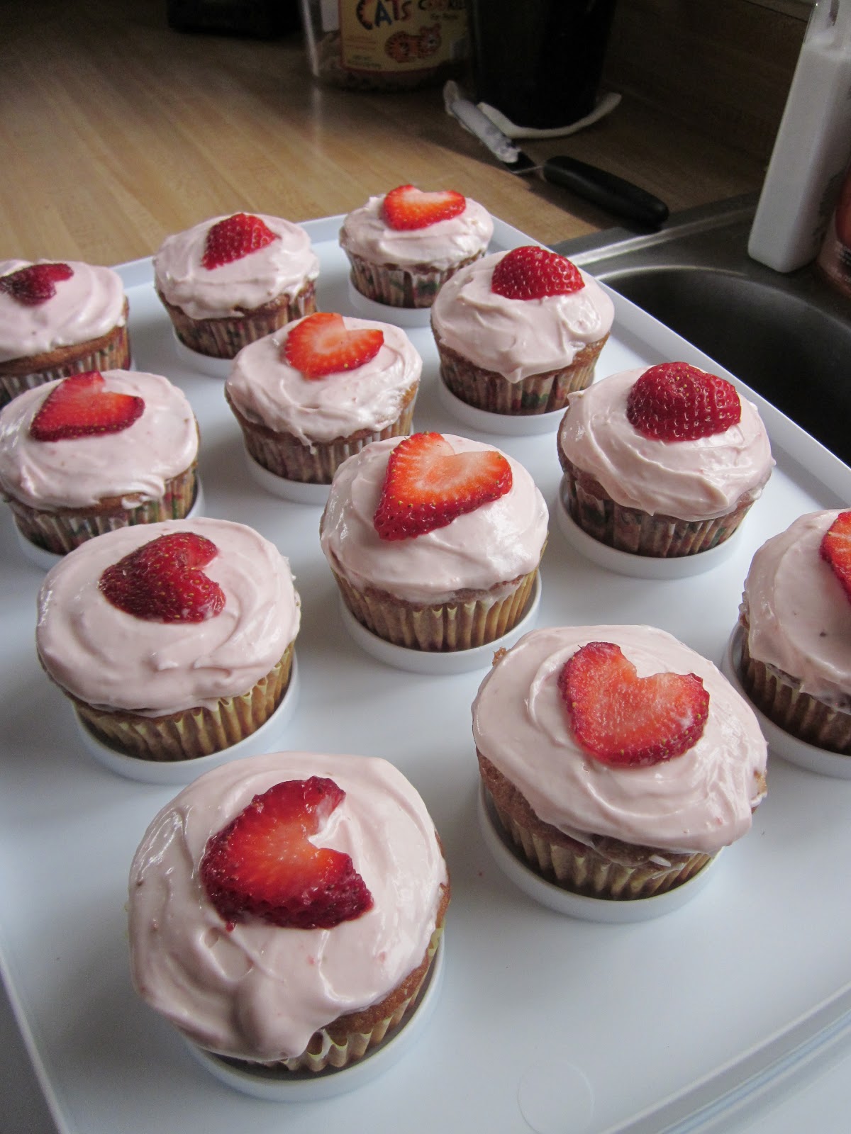 They were perhaps the girliest thing I have ever made, for a not so girly friend, and by a not so girly me, but luckily they were awesome. I think even the manliest of men would enjoy a little strawberry cupcake with pink frosting and a heart garnish!
